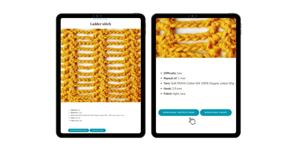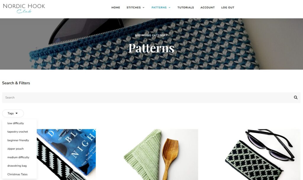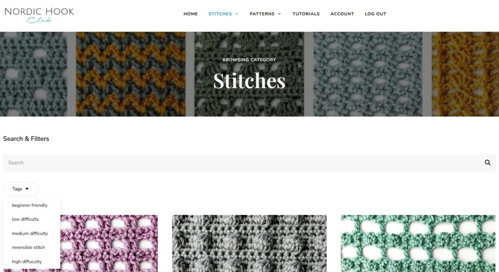 It is easy to explore content by categories. Within Stitches you will find different categories: solid, lacy, textured and multicolor stitches. You can click on a particular category that you are interested in or just on Stitches to explore all crochet stitches starting from the latest and going backward. Similarly with Patterns: you can choose to explore patterns based on category or just look at all of them by clicking Patterns.