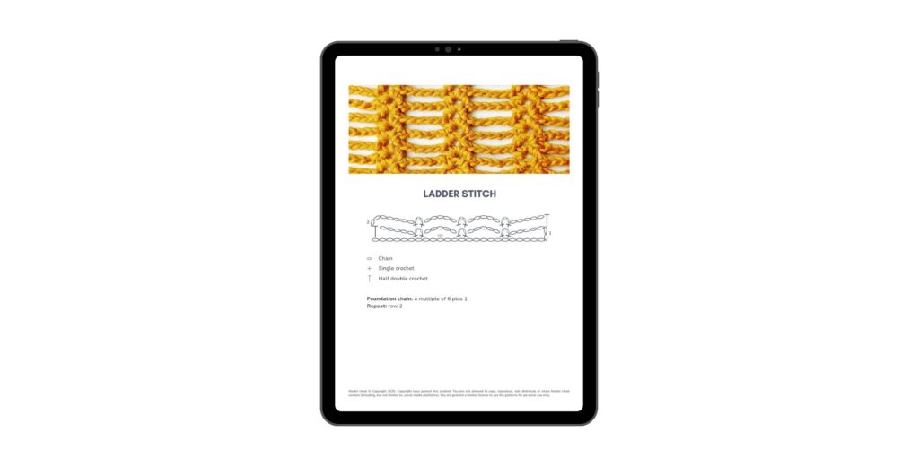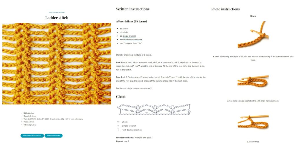 Each stitch contains a large photo of the final result, a short summary about the stitch indicating the difficulty level, the number of rows or rounds you have to repeat, the yarn used in the tutorial and the hook size. Next, you will find a short written pattern with an abbreviation list followed by a chart and detailed step-by-step photo instructions.