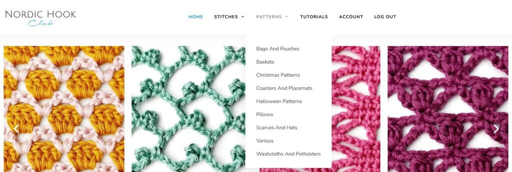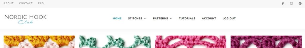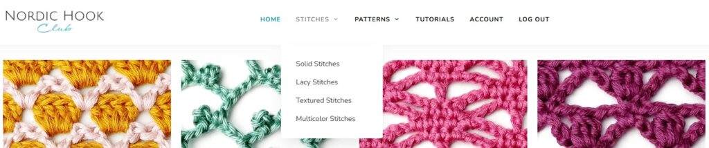 In the main menu on the Home page you will find stitches, patterns, tutorials, your account in the Nordic Hook Club and a log in/log out button. On tablets and phones you can find the main menu in the top right corner.